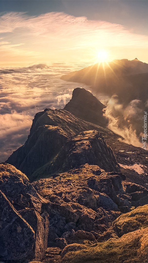 Edytor tapety: Słońce zdobywające górskie szczyty