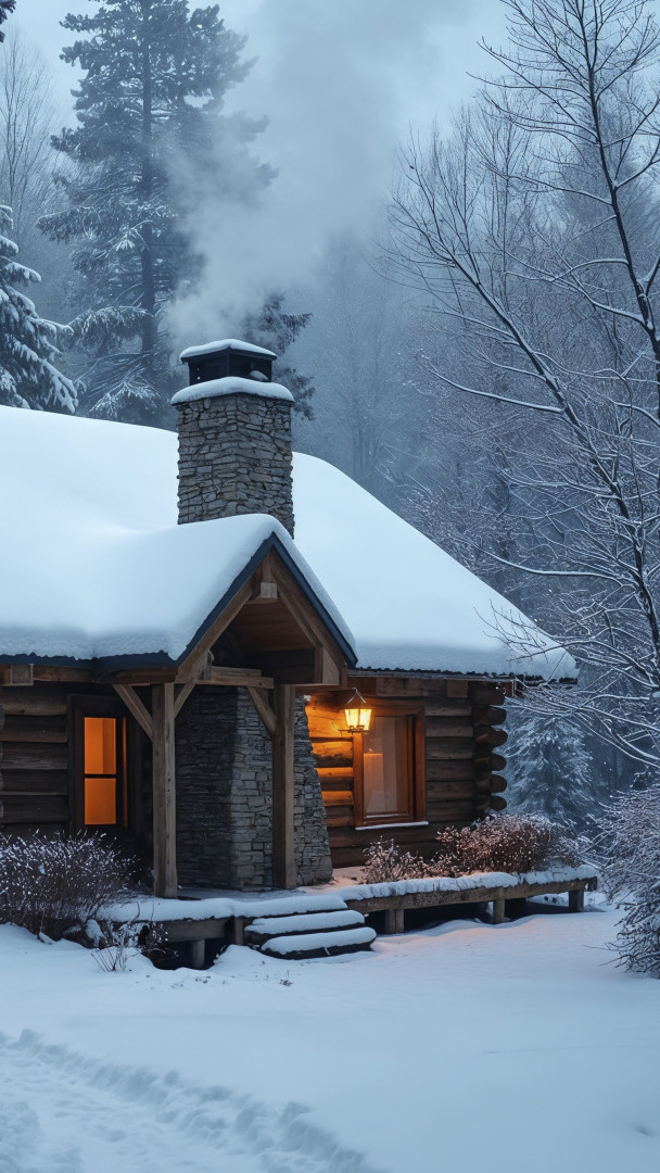 Edytor tapety: Ośnieżony dom w zamglonym lesie