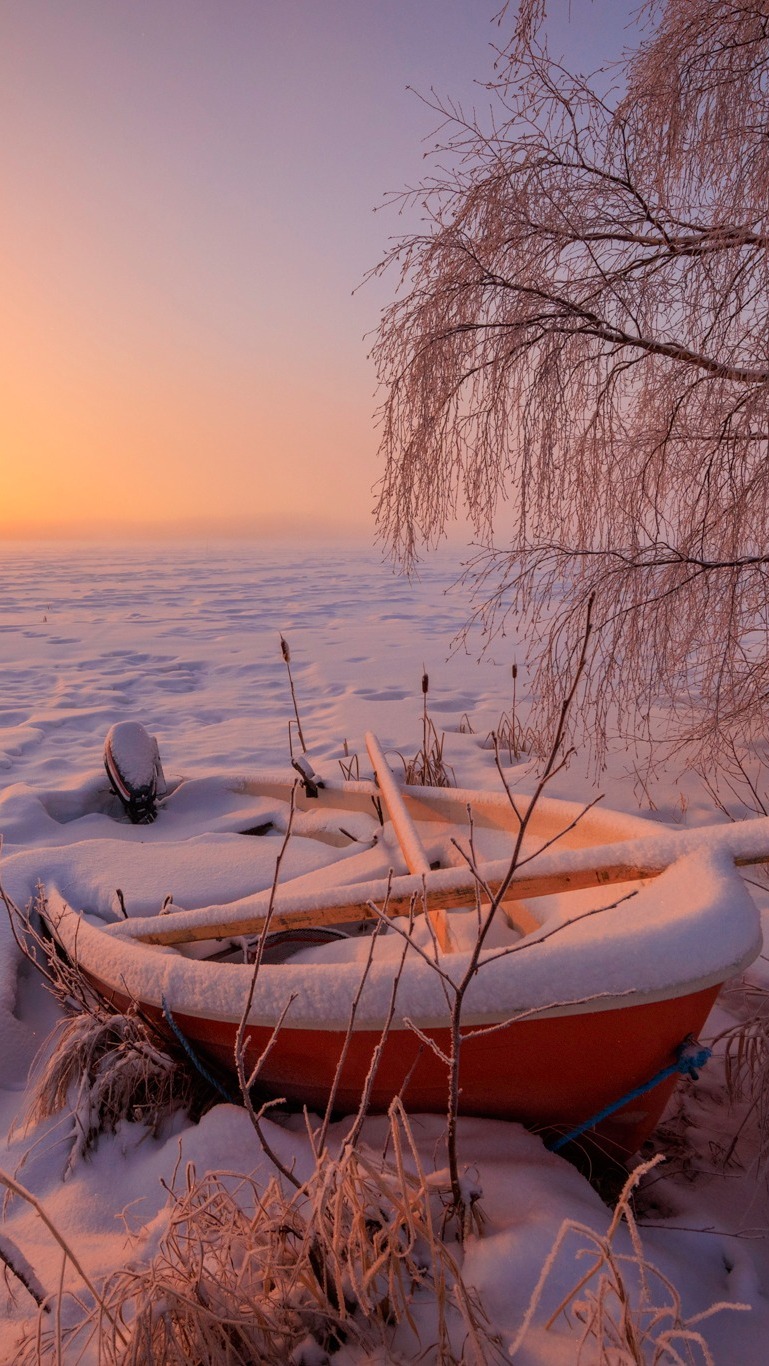 Edytor tapety: Ośnieżona łódka pod brzozą