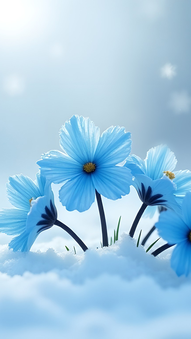 Edytor tapety: Rozświetlone niebieskie kwiaty w śniegu