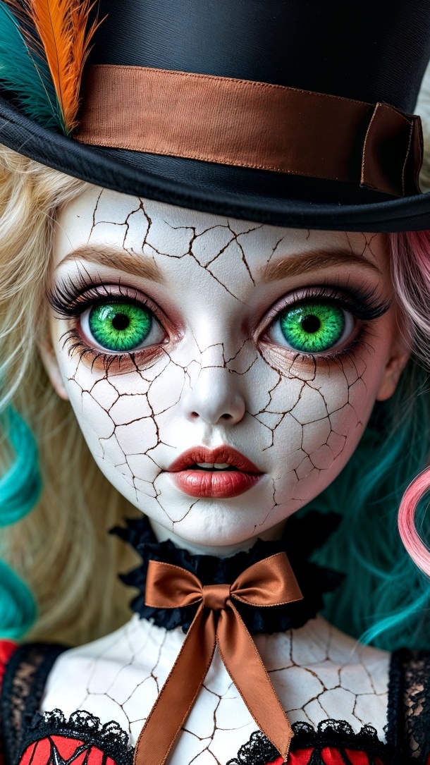 Edytor tapety: Popękana twarz zielonookiej porcelanowej lalki