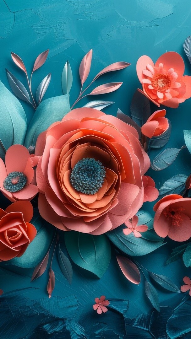 Edytor tapety: Papierowe czerwone kwiaty na niebieskim tle