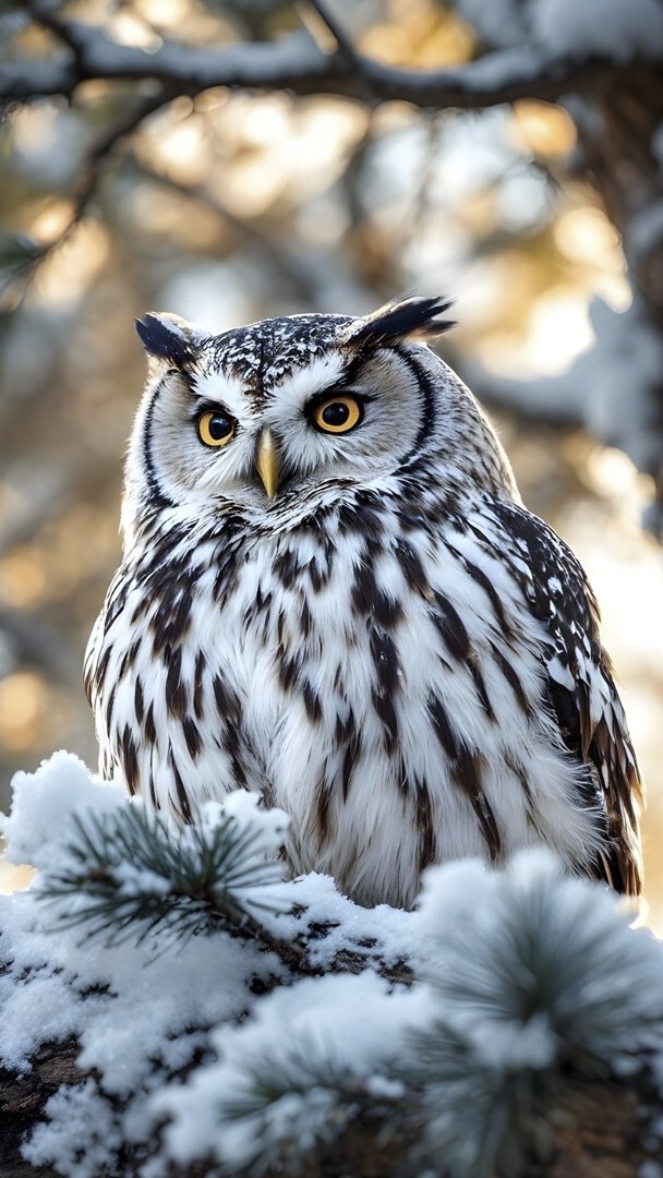 Edytor tapety: Puchacz na ośnieżonej gałęzi sosny