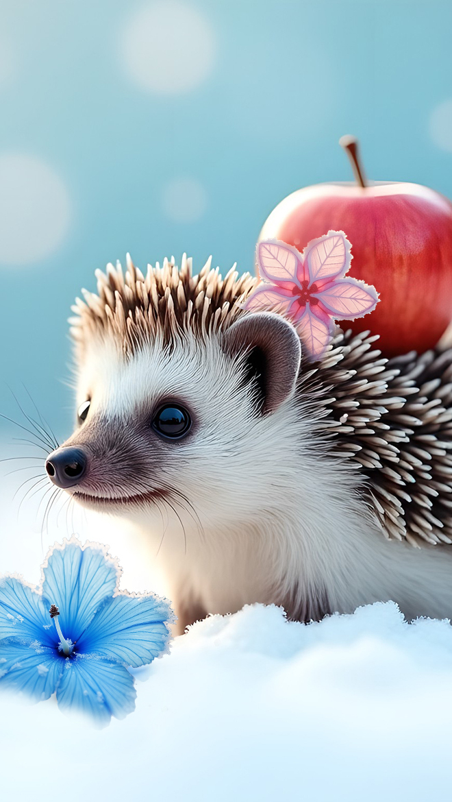 Edytor tapety: Jeż z jabłkiem na śniegu