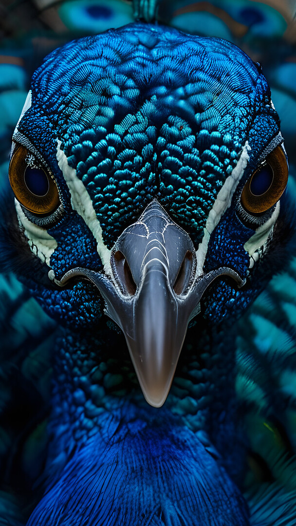 Edytor tapety: Głowa niebieskiego pawia w zbliżeniu