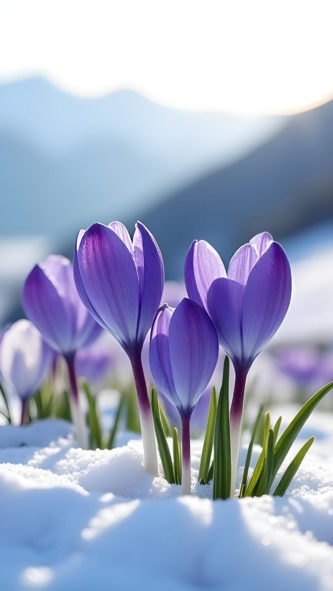 Edytor tapety: Rozświetlone fioletowe krokusy w śniegu
