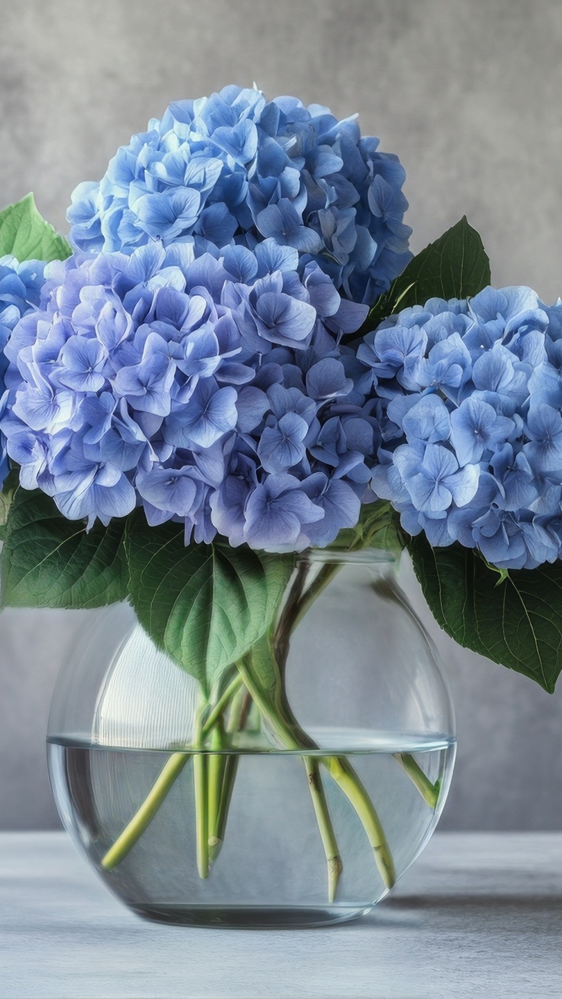 Edytor tapety: Niebieskie hortensje w szklanym wazonie