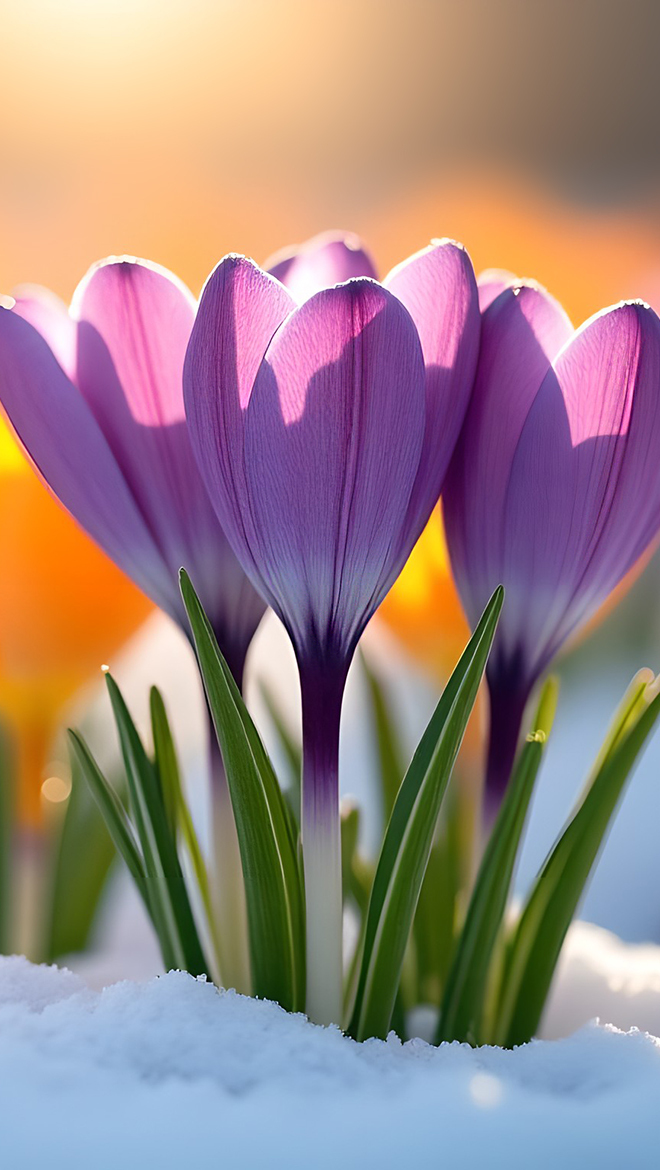 Edytor tapety: Rozświetlone fioletowe krokusy w śniegu