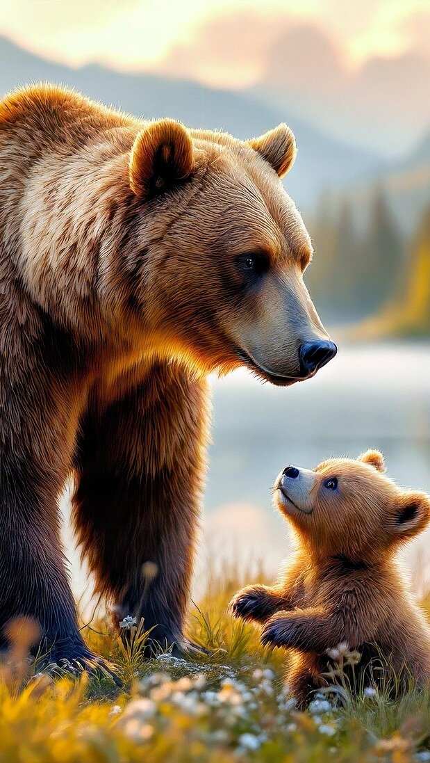 Edytor tapety: Niedźwiedzica z niedźwiadkiem nad jeziorem