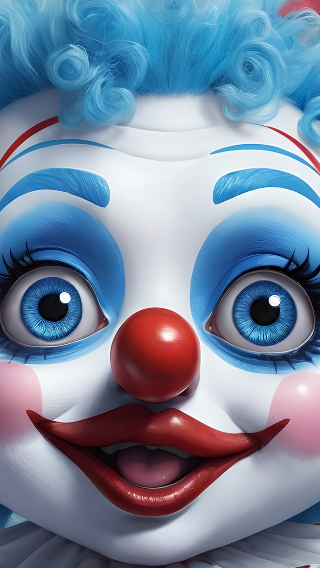 Edytor tapety: Twarz uśmiechniętego klauna z niebieskimi włosami
