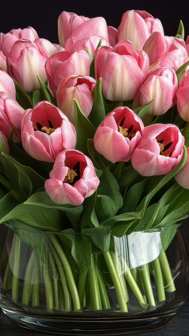 Edytor tapety: Bukiet różowych tulipanów w szklanym wazonie