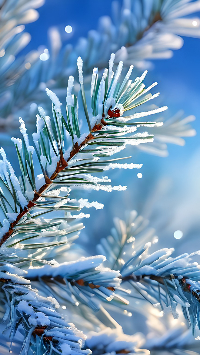 Edytor tapety: Rozświetlone i ośnieżone gałązki świerkowe