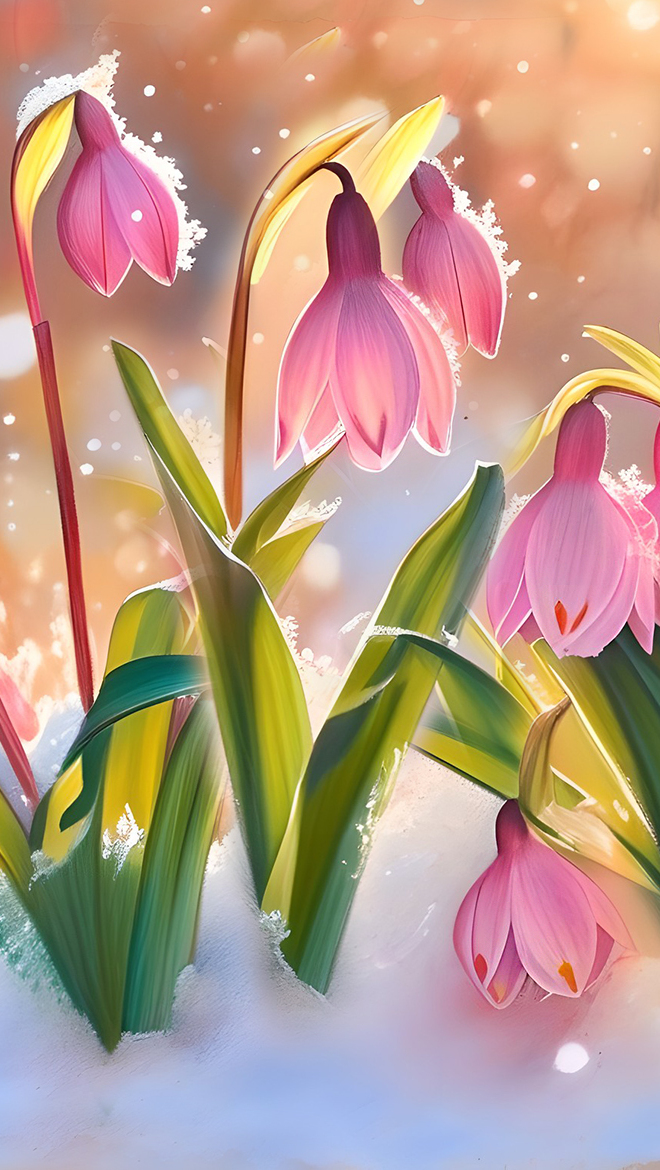 Edytor tapety: Pochylone różowe kwiaty w śniegu