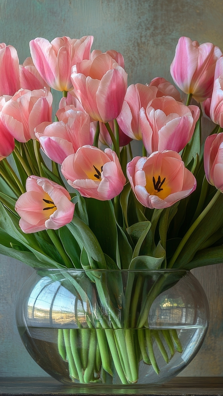 Edytor tapety: Jasnoróżowe tulipany w szklanym wazonie