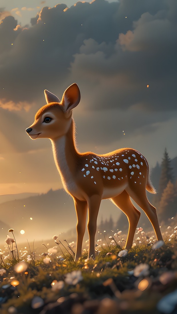 Edytor tapety: Jelonek na łące pod ciemnymi chmurami