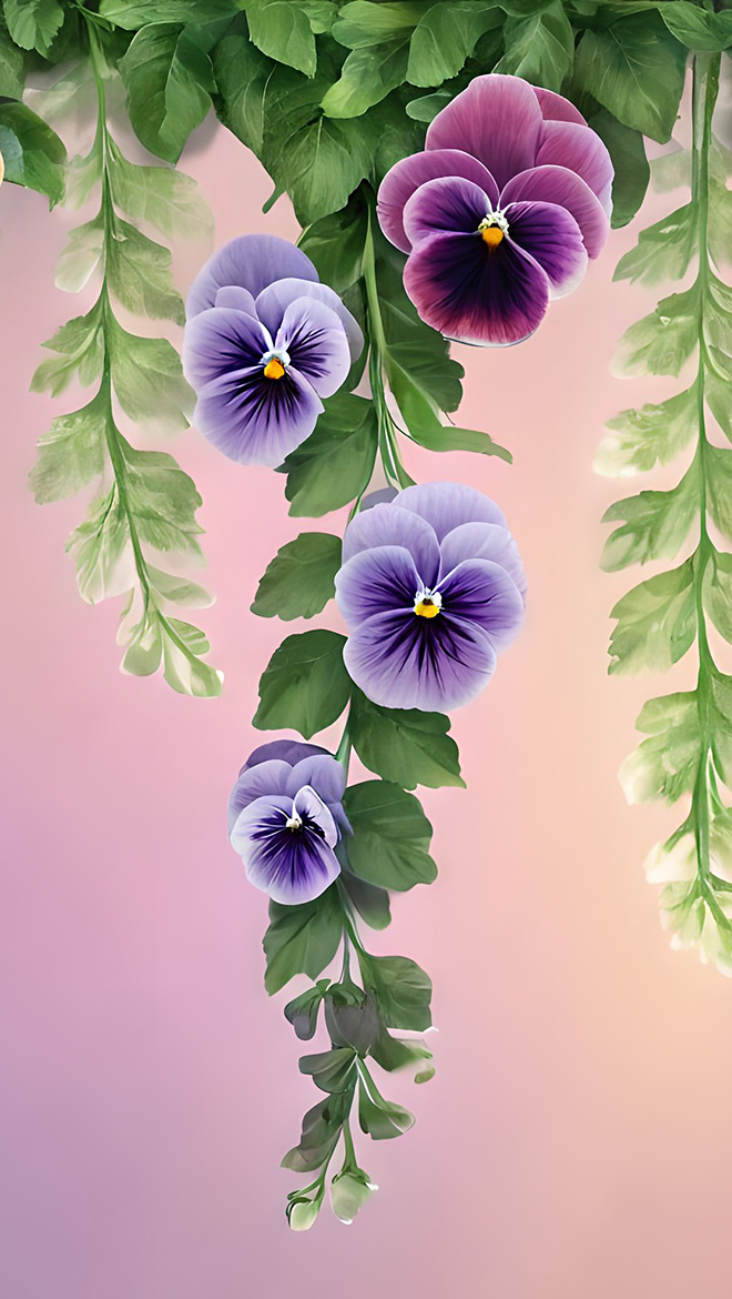 Edytor tapety: Fioletowe bratki na zwisających liściach
