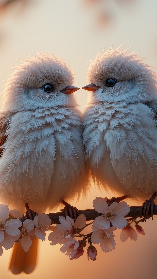 Edytor tapety: Dwa młode ptaki na ukwieconej gałązce
