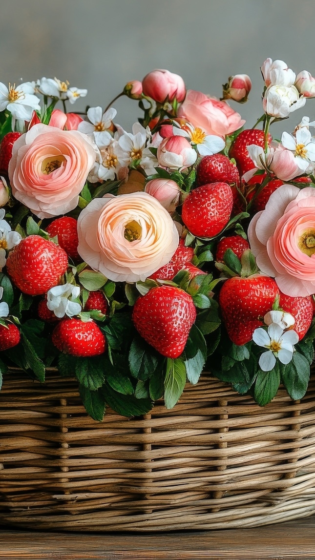 Edytor tapety: Kwiaty i truskawki w koszyku