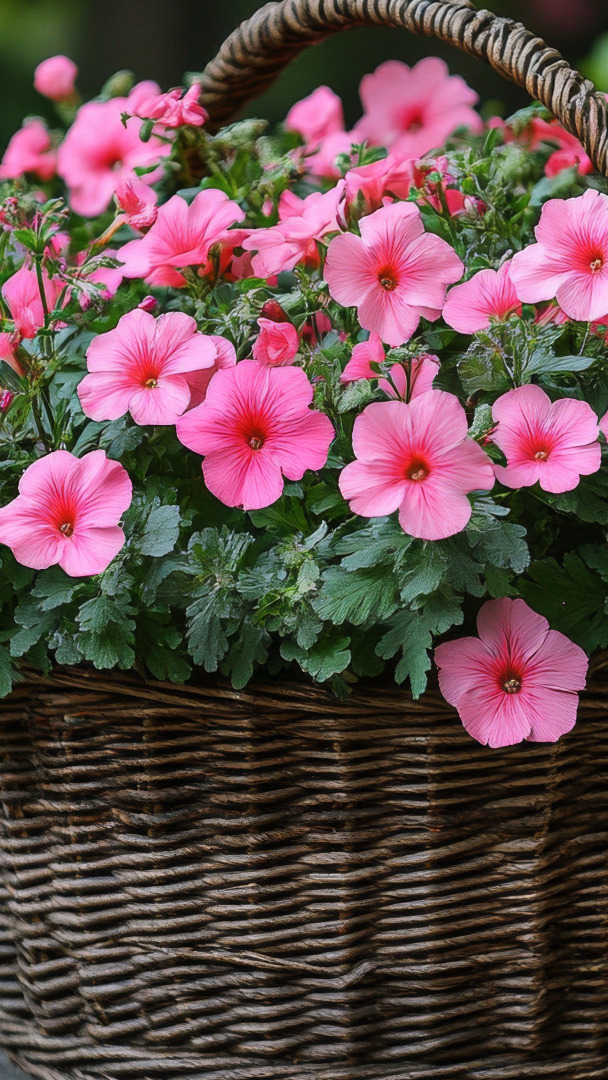 Edytor tapety: Rozkwitnięte różowe petunie w koszyku