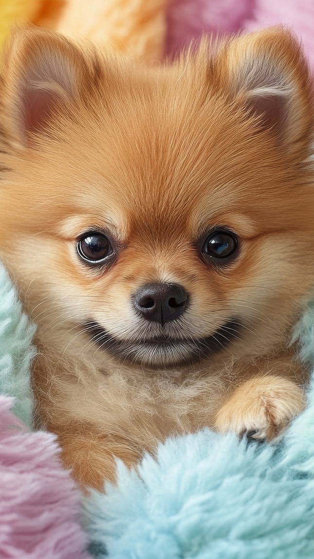 Edytor tapety: Szczeniak leżący na kolorowym kocu