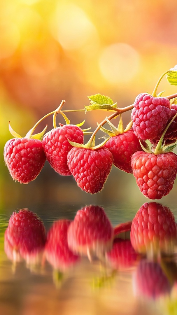 Edytor tapety: Odbicie w wodzie gałązki z malinami