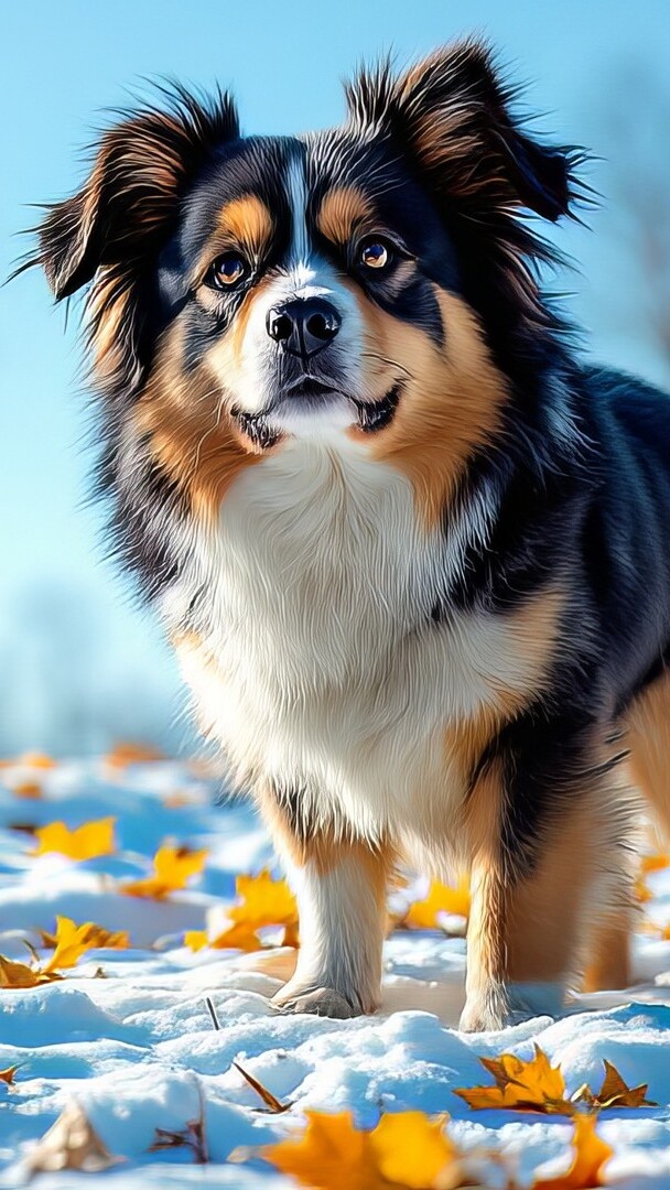 Edytor tapety: Pies i żółte liście na śniegu