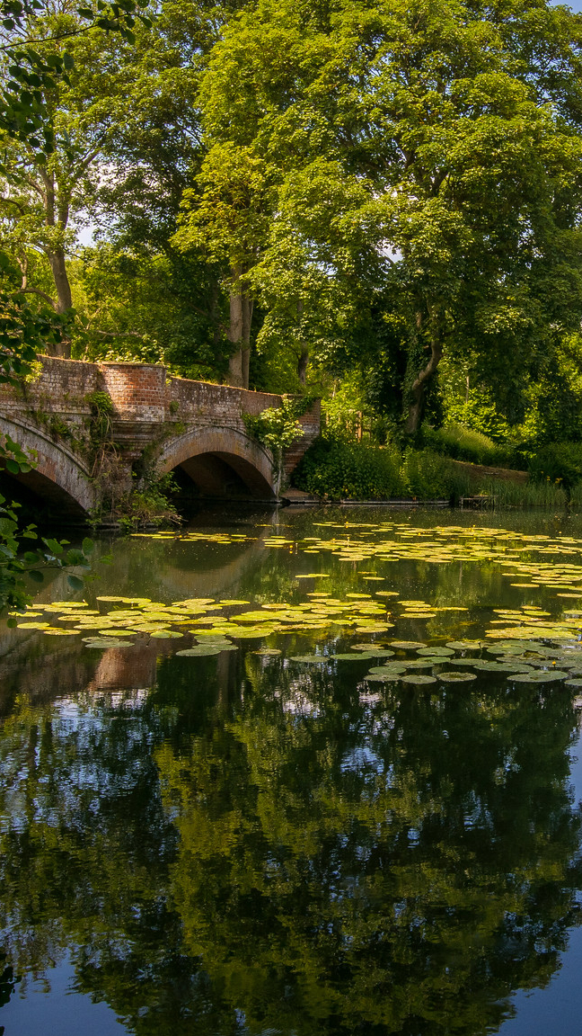Edytor tapety: Drzewa i kamienny most nad stawem