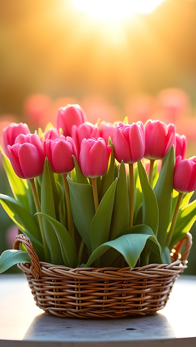 Edytor tapety: Rozświetlone słonecznym blaskiem tulipany w koszyku