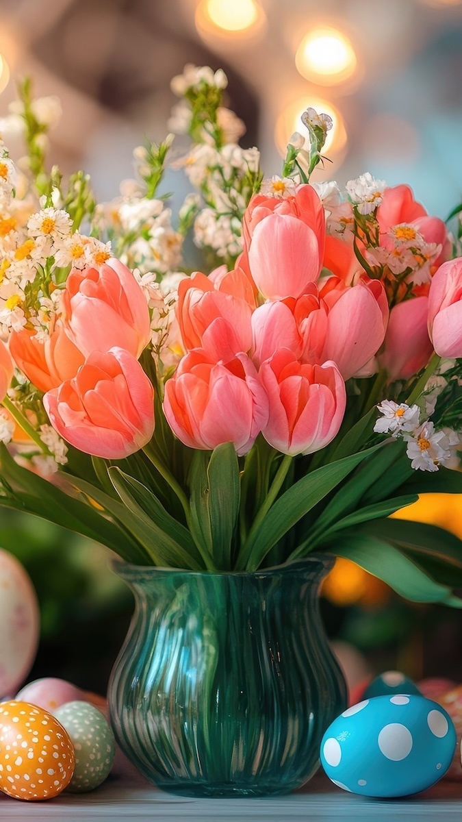 Edytor tapety: Pisanki obok wazonu z kwiatami