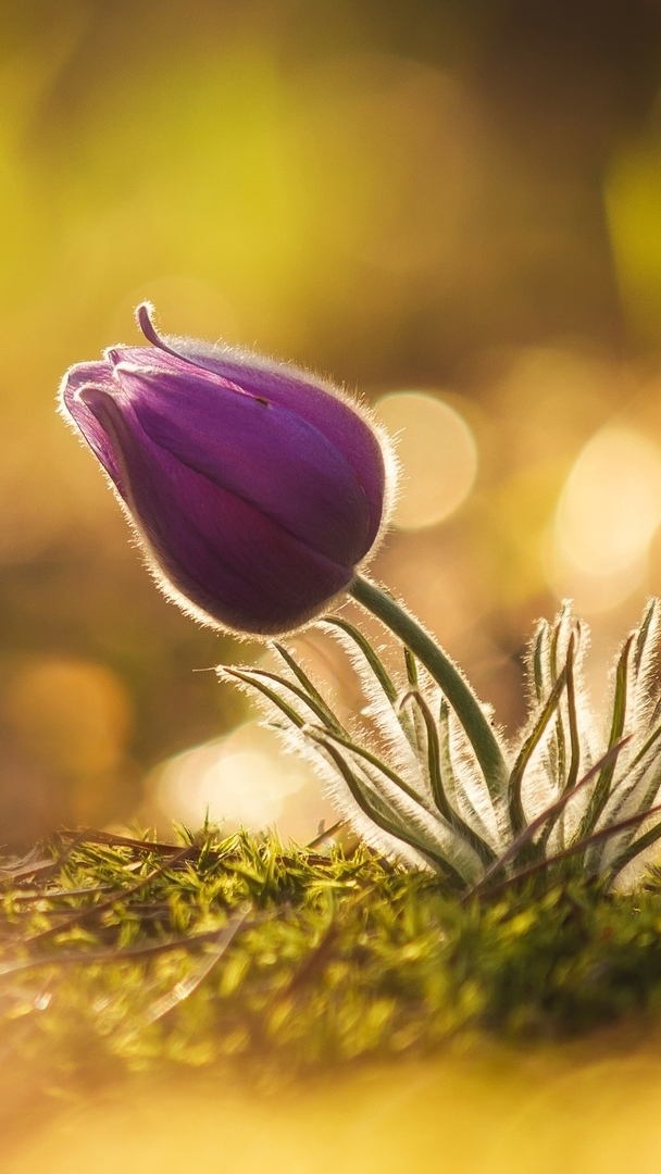 Edytor tapety: Pochylona fioletowa sasanka w blasku światła