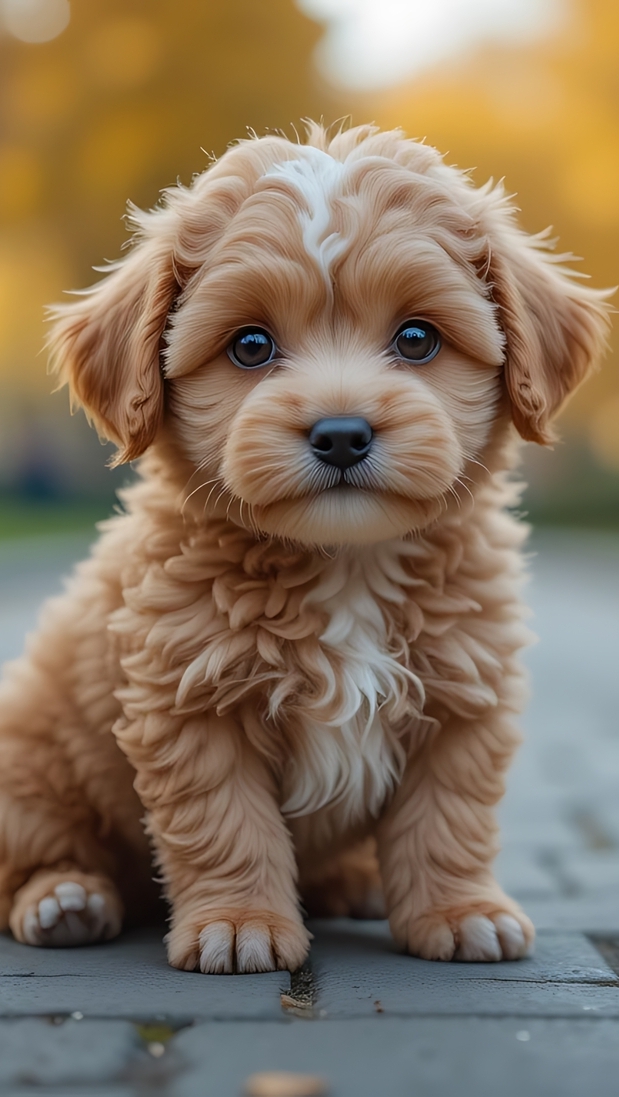 Edytor tapety: Siedzący na bruku mały brązowy szczeniak