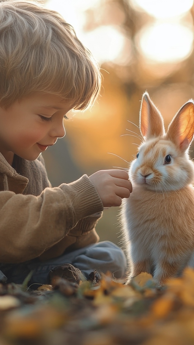 Edytor tapety: Siedzący chłopiec obok królika
