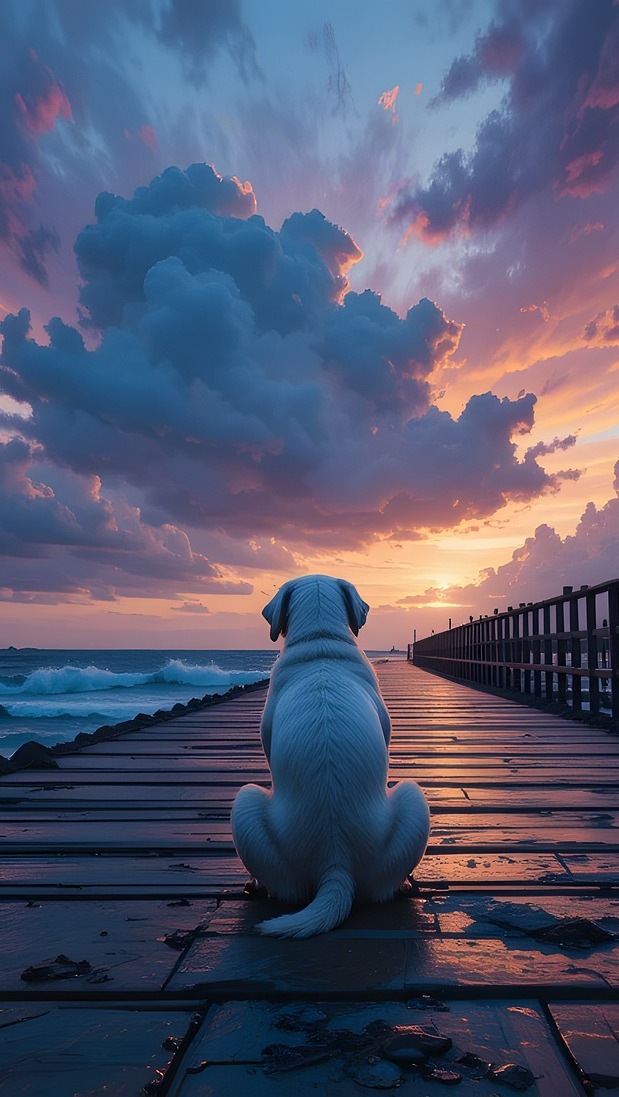 Edytor tapety: Pies siedzący na pomoście nad morzem