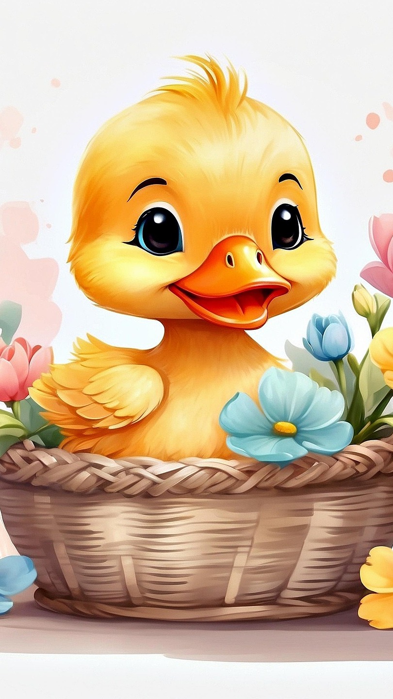 Edytor tapety: Kaczuszka i kolorowe kwiaty w koszyku