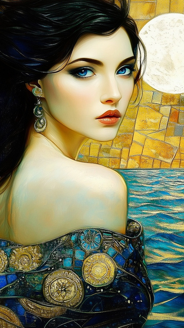 Edytor tapety: Brunetka nad wodą na tle księżyca
