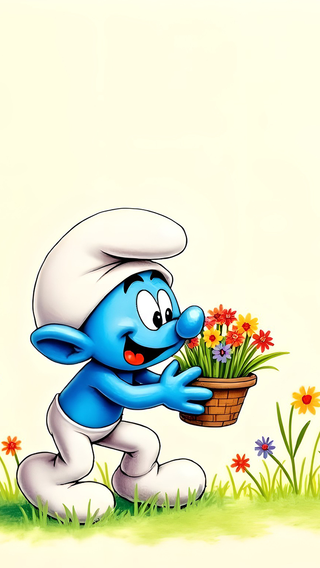 Edytor tapety: Smerf z koszyczkiem kolorowych kwiatów