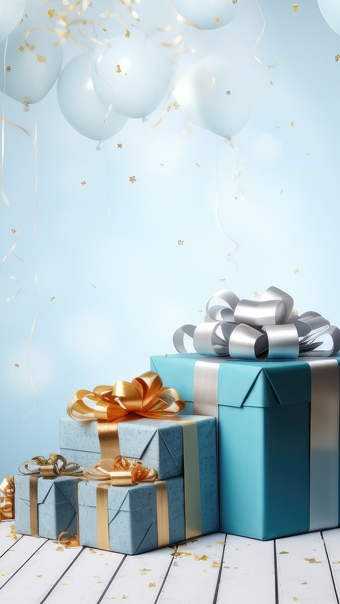 Edytor tapety: Prezenty z kokardami oraz białe baloniki