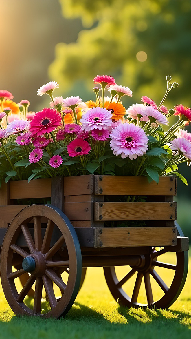 Edytor tapety: Kolorowe kwiaty w drewnianym wózku