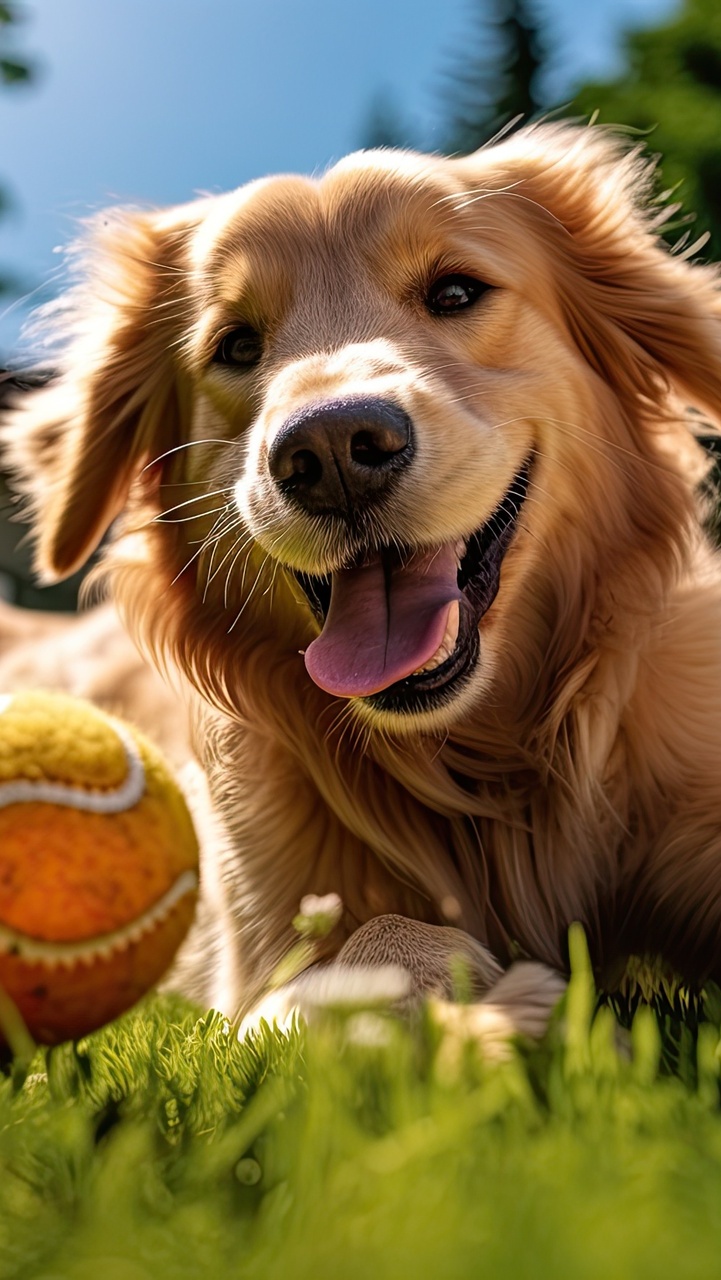 Edytor tapety: Golden retriever z piłką na trawie