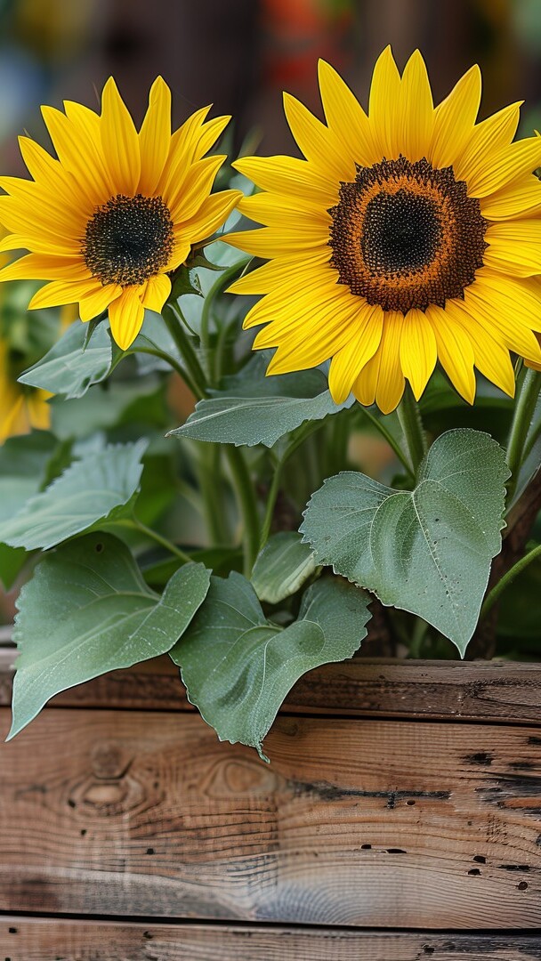 Edytor tapety: Dwa słoneczniki w drewnianej skrzynce