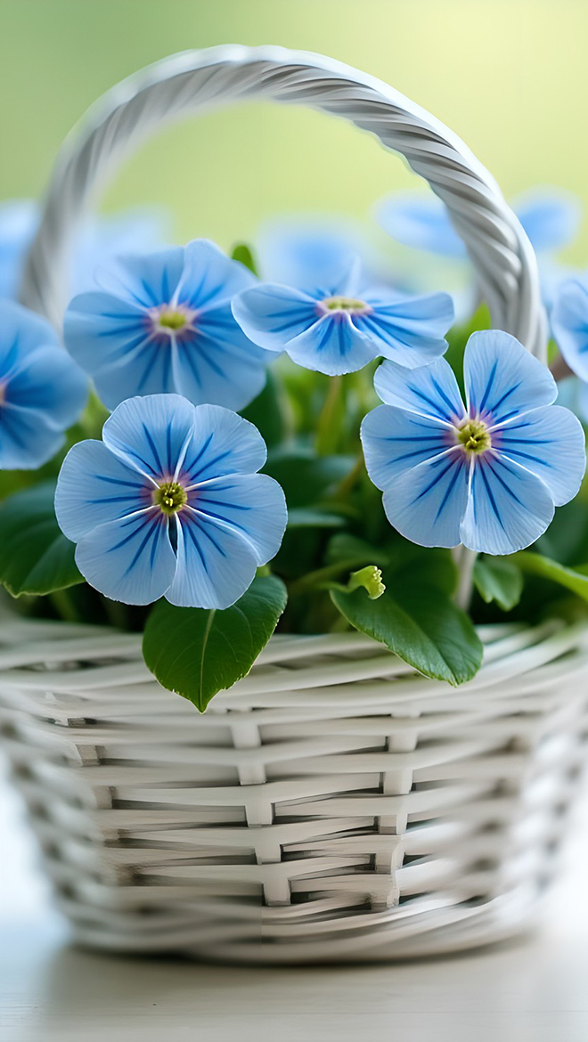 Edytor tapety: Biały koszyk z niebieskimi kwiatami