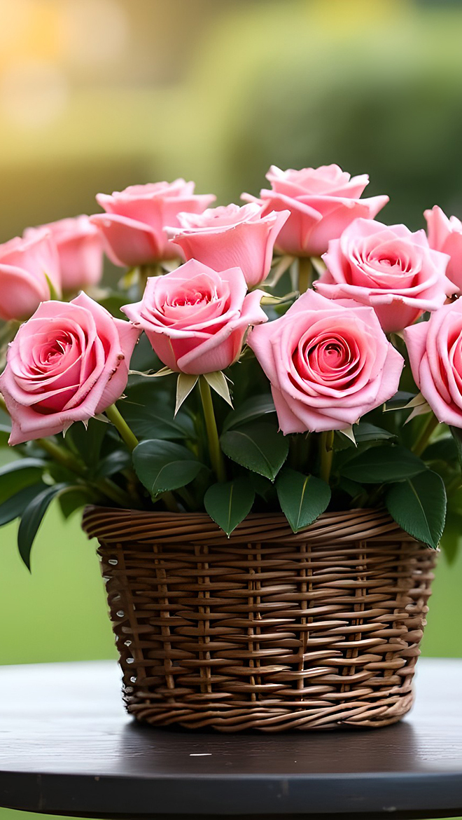 Edytor tapety: Różowe róże w koszyku na stoliku