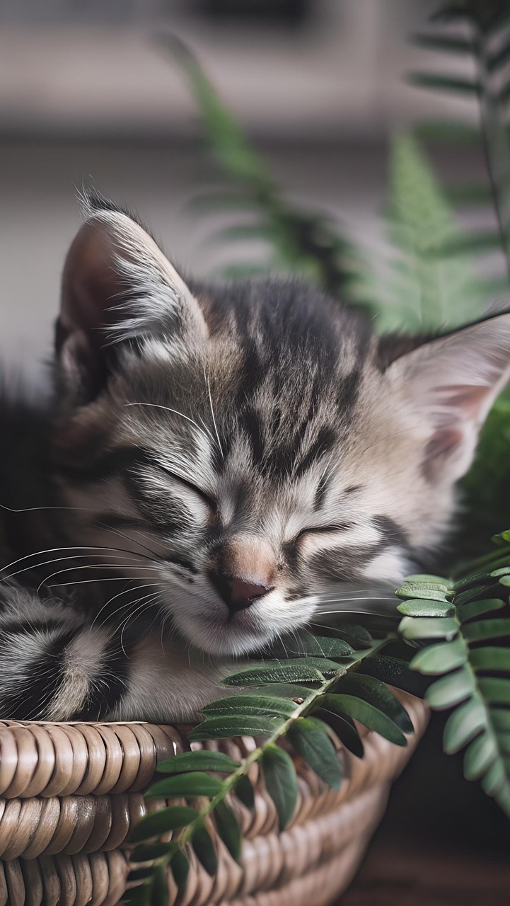 Edytor tapety: Śpiący mały kot obok liści