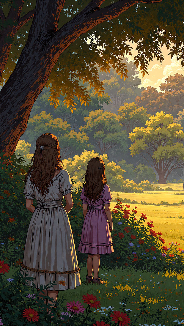 Edytor tapety: Dwie dziewczynki obok kwiatów pod drzewem