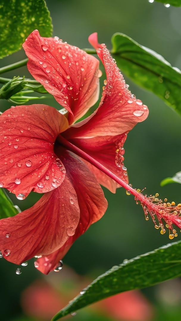 Edytor tapety: Krople na czerwonym kwiatku hibiskusa