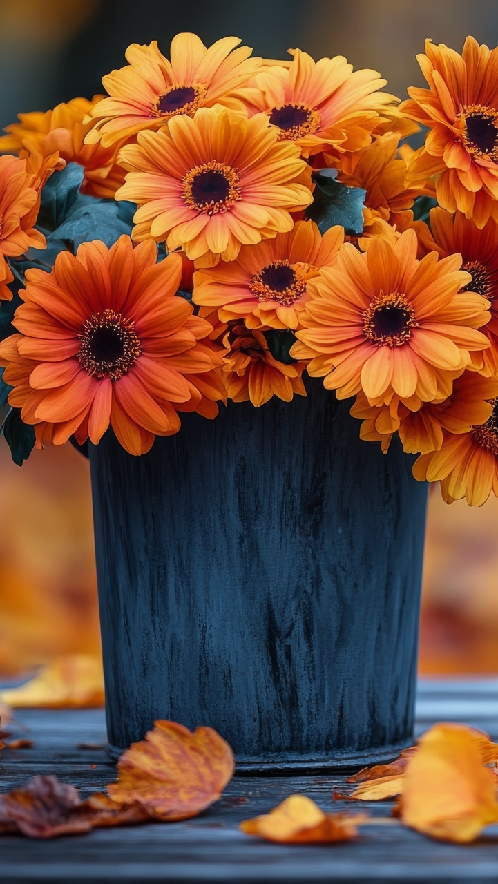 Edytor tapety: Pomarańczowe gerbery w ciemnoniebieskim wazonie