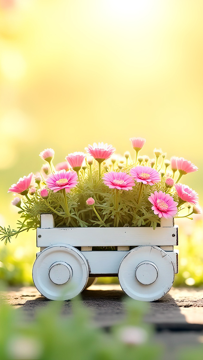 Edytor tapety: Mały biały wózek z różowymi kwiatami