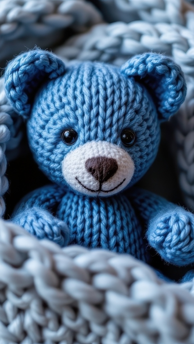 Edytor tapety: Niebieski wełniany miś leżący na szalu