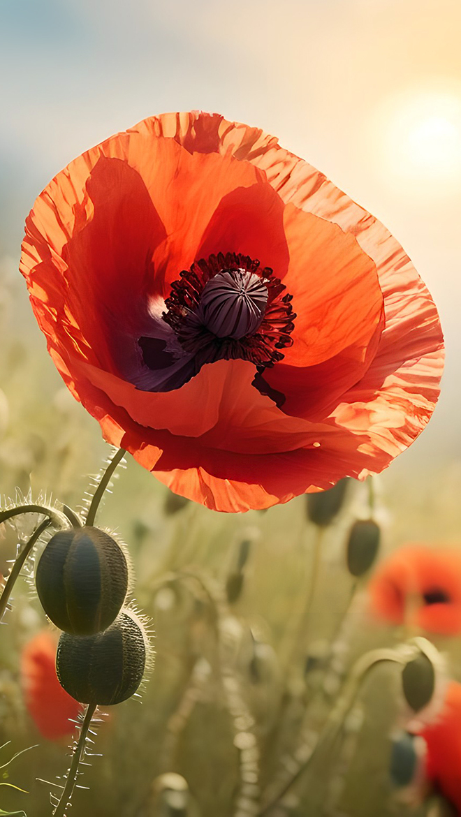 Edytor tapety: Rozświetlony czerwony mak z pąkami