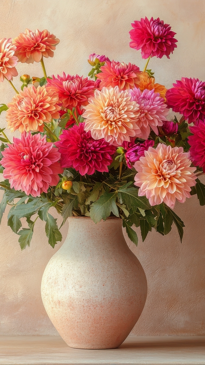 Edytor tapety: Kolorowe dalie w beżowym wazonie